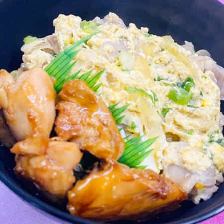 白ご飯にあーちゃんのから揚げが5個のって真ん中にポーチドエッグ、美味しいポン酢あんをたっぷりかけてマヨビーム!男唐(もも肉醬油味)変更がおススメです!